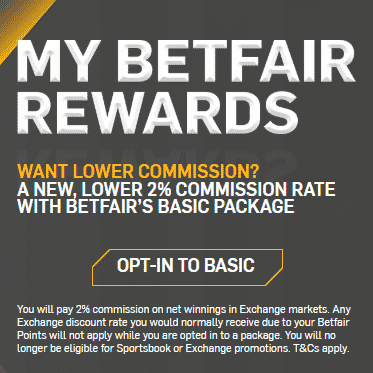 To opt into paying just 2% commission, simply visit the ‘My Account‘ section of your Betfair account and select the ‘Basic‘ rewards plan. The 2% commission rate will be applied to your account immediately and you can start making those commission savings.