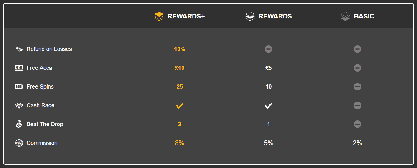 As you can see, Rewards+ is very much tailored towards the Sportsbook side of things, with plenty of offers and a hefty Exchange commission rate of 8%.