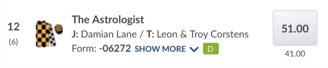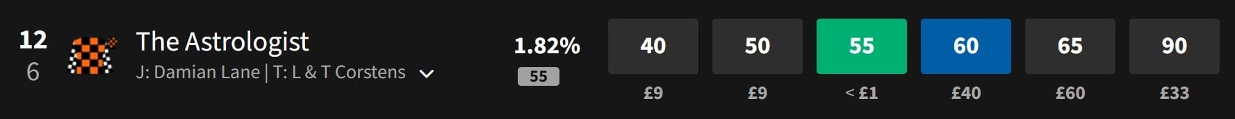 As you can see, the calculator tells me I need to lay £8.50 on The Astrologist ‘To Win‘ and £8.47 on The Astrologist ‘To place (top 3)‘.