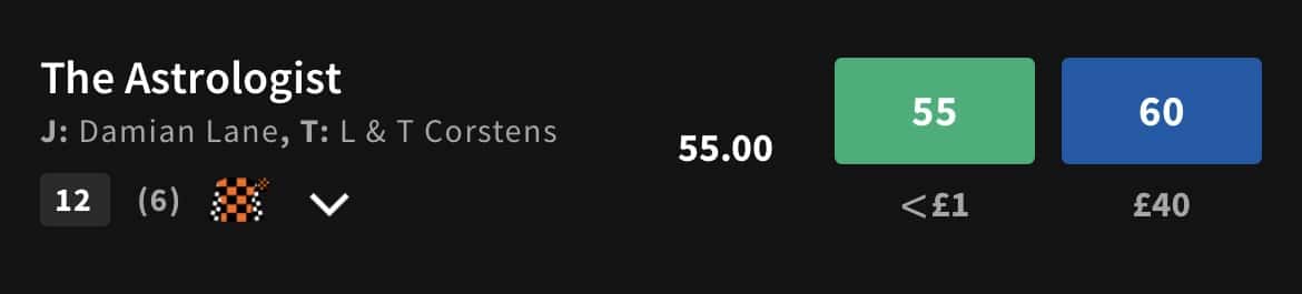 After browsing the odds on the bookmaker and exchange, I chose The Astrologist. As you can see below, I got close odds on both the win (50.00 & 60.00) and place (11.00 & 13.00) parts of the bet. Remember, when doing this manually, you need to work out the place odds yourself. Both of these combined made it a profitable opportunity.